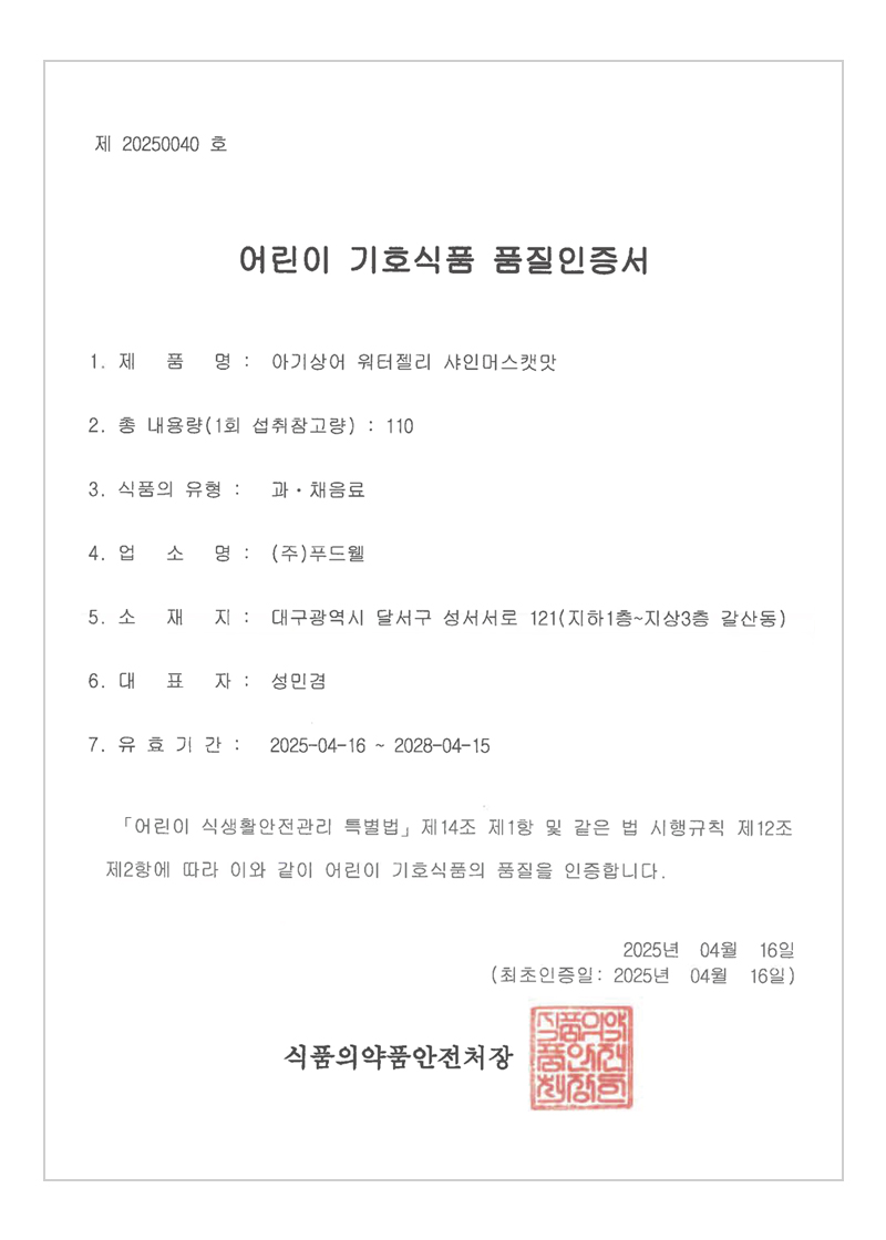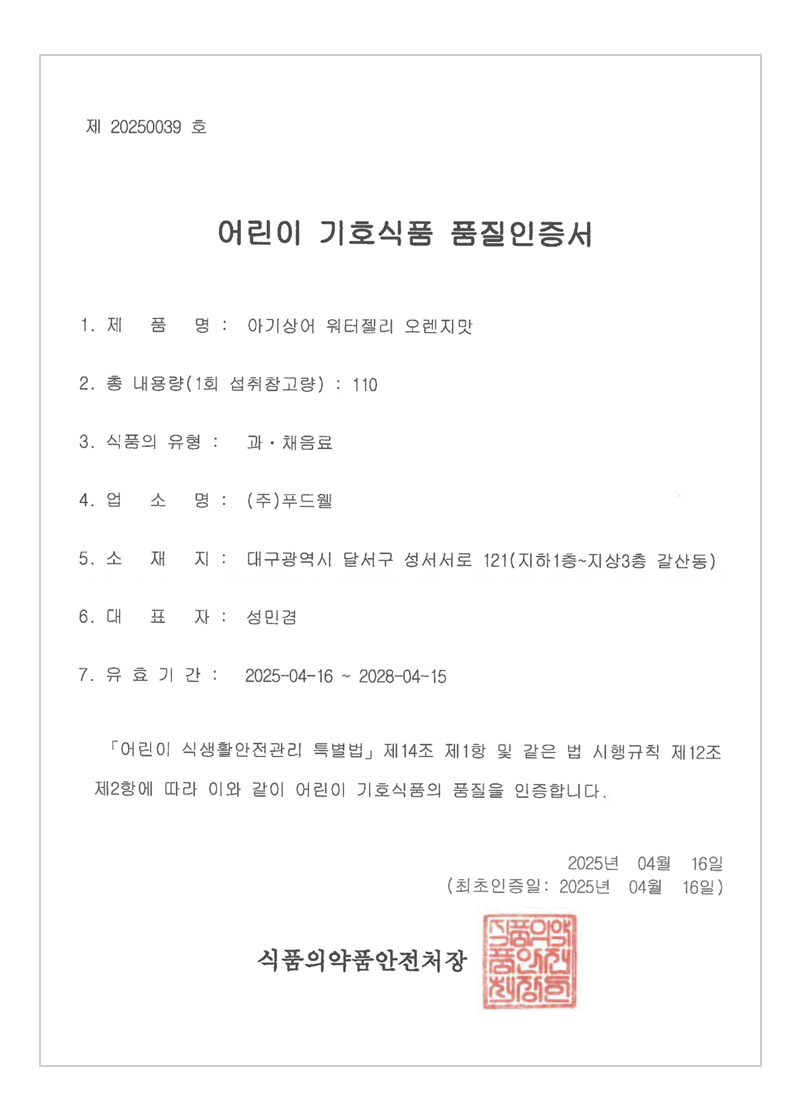 식품의약품안전처 기준에 적합한 어린이 기호식품에 대하여 품질인증. 안전하고 영양을 고루 갖춘 어린이 기호식품을 제조·가공·유통·판매하여 식품의 안전성을 확보.