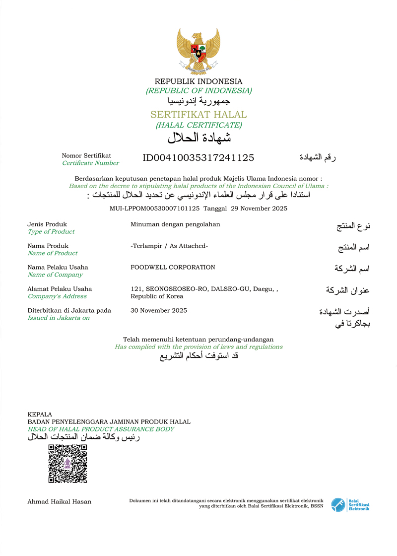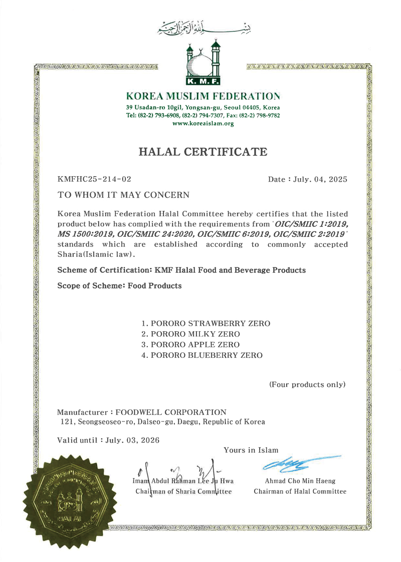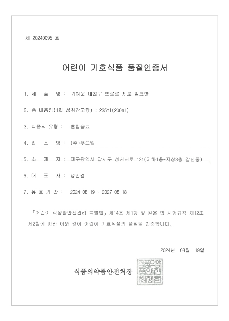 인증제품 : 뽀로로 우유, 딸기, 사과, 블루베리, 복숭아, 망고, 리치, 청포도, 우유 제로, 사과 제로, 블루베리 제로, 딸기 제로