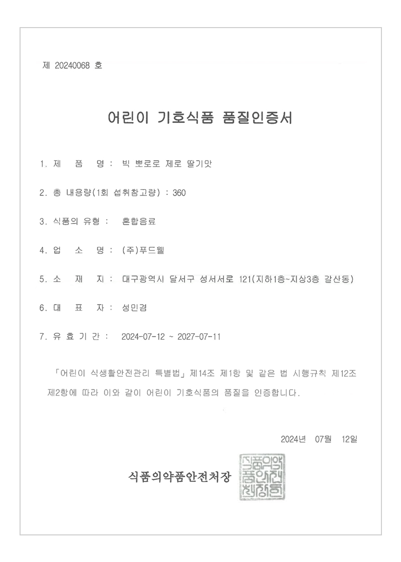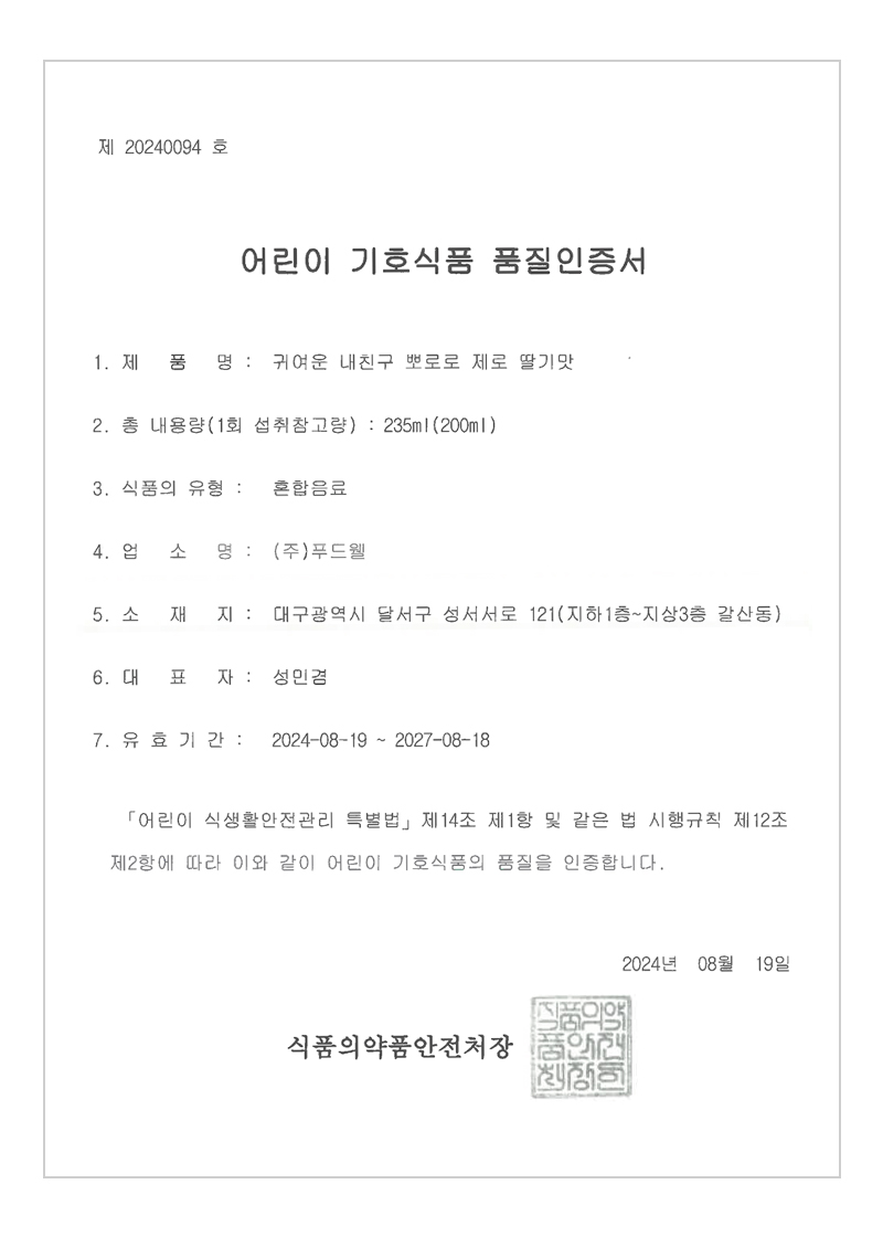 인증제품 : 뽀로로 딸기 제로, 사과 제로, 블루베리 제로, 우유 제로