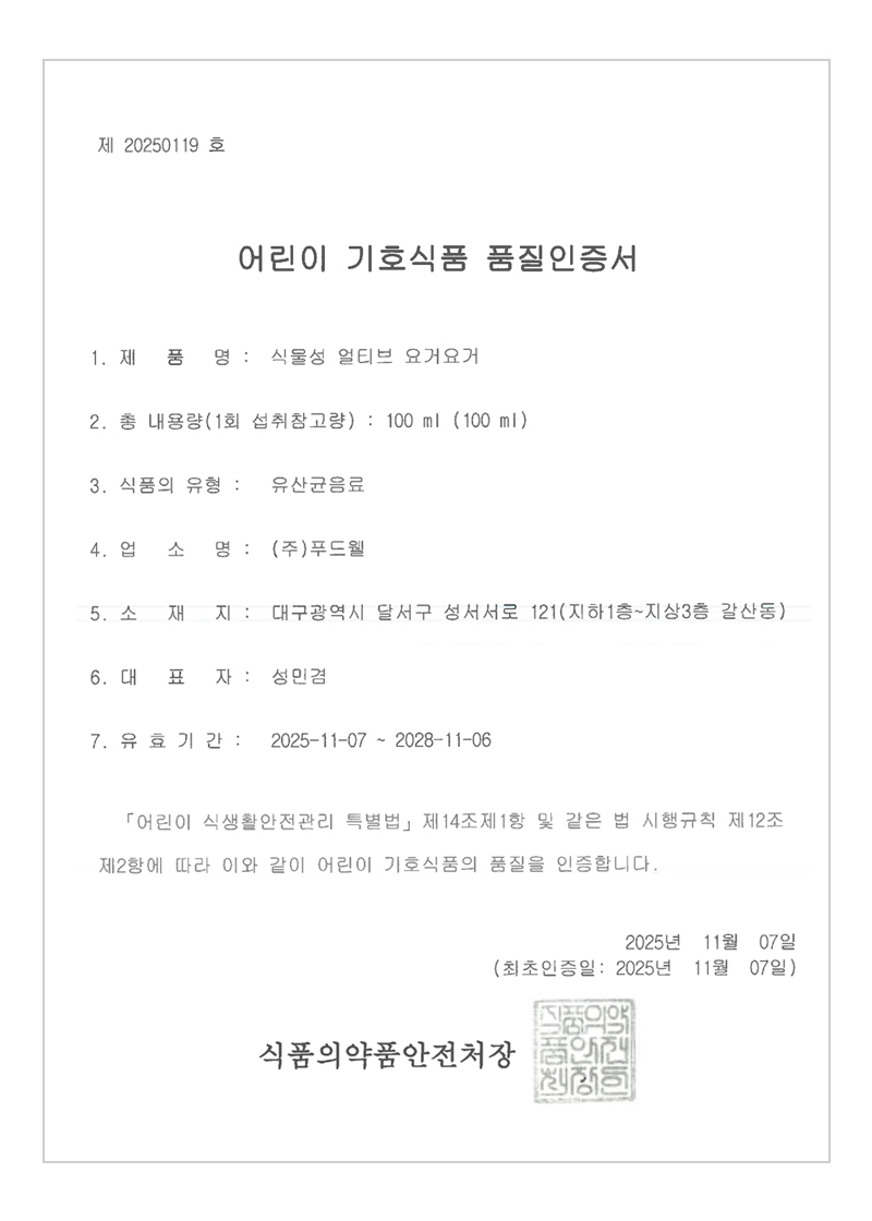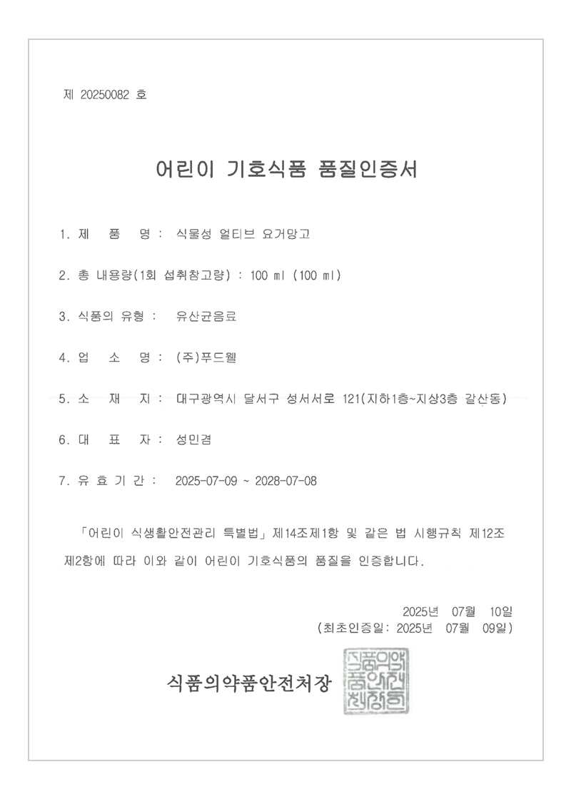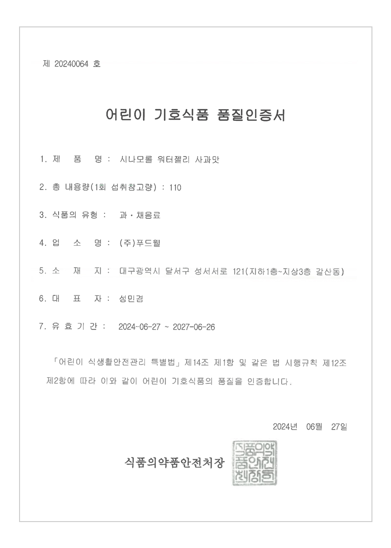 식품의약품안전처 기준에 적합한 어린이 기호식품에 대하여 품질인증. 안전하고 영양을 고루 갖춘 어린이 기호식품을 제조·가공·유통·판매하여 식품의 안전성을 확보.
