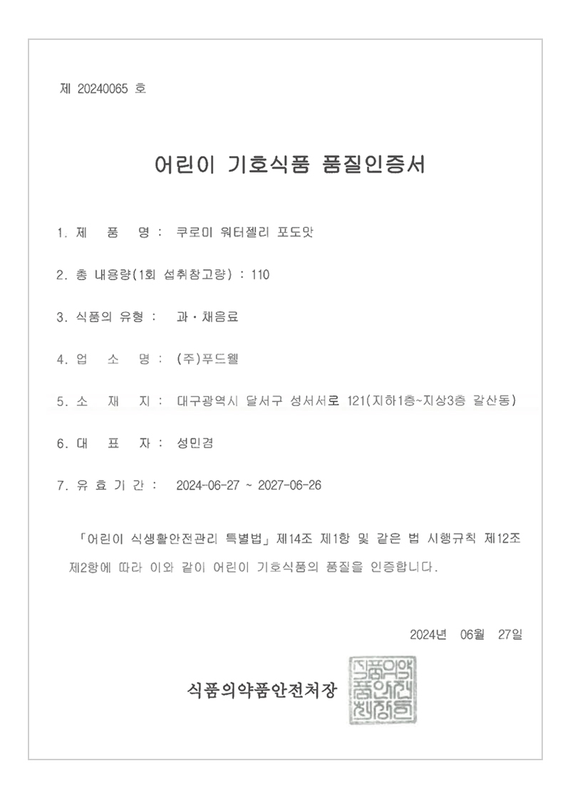 품질인증제품 : 쿠로미 워터젤리 포도맛 / 과채음료