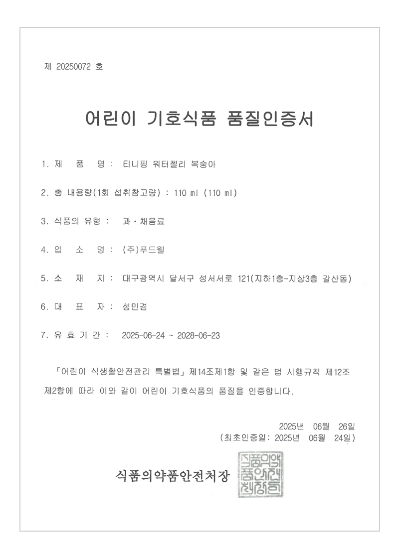 품질인증제품 : 티니핑 워터젤리 복숭아맛 / 과채음료