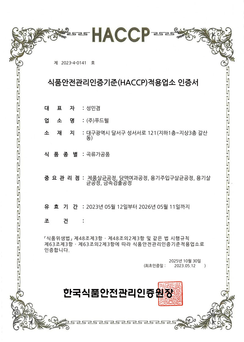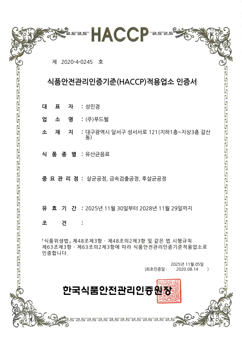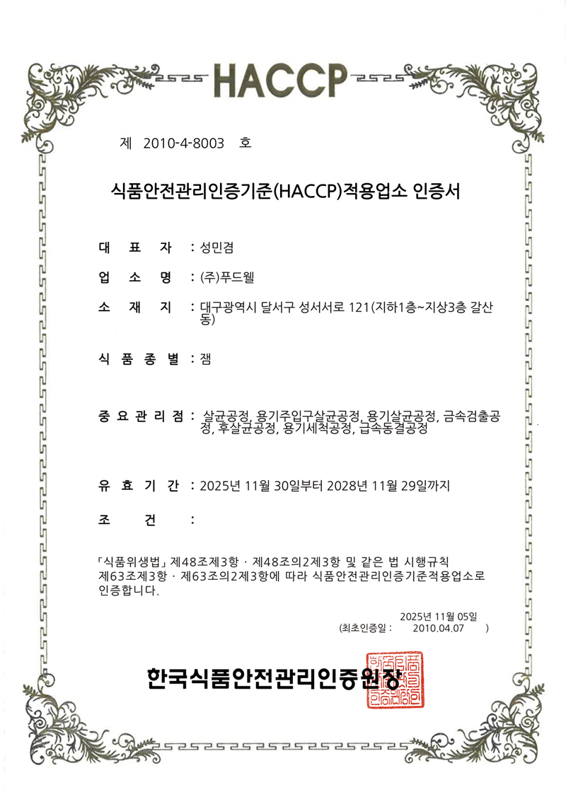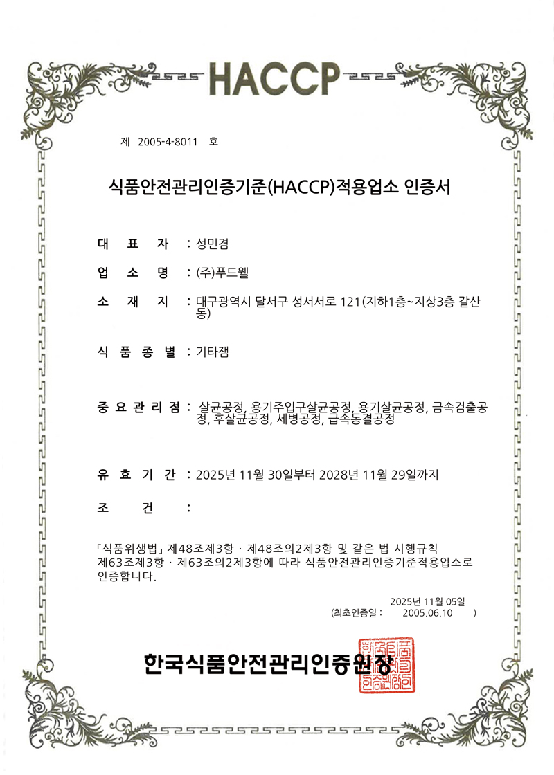 2005년 최초로 HACCP 적용업소로 지정. 식품의 원료생산 단계에서부터 최종소비에 이르기까지 발생할 수 있는 모든 위해를 파악하고, 중요관리점을 선정 관리함으로써 식품의 안전성을 확보하기 위한 예방차원의 관리활동으로 구성.