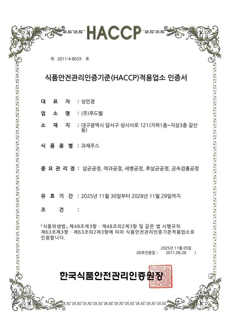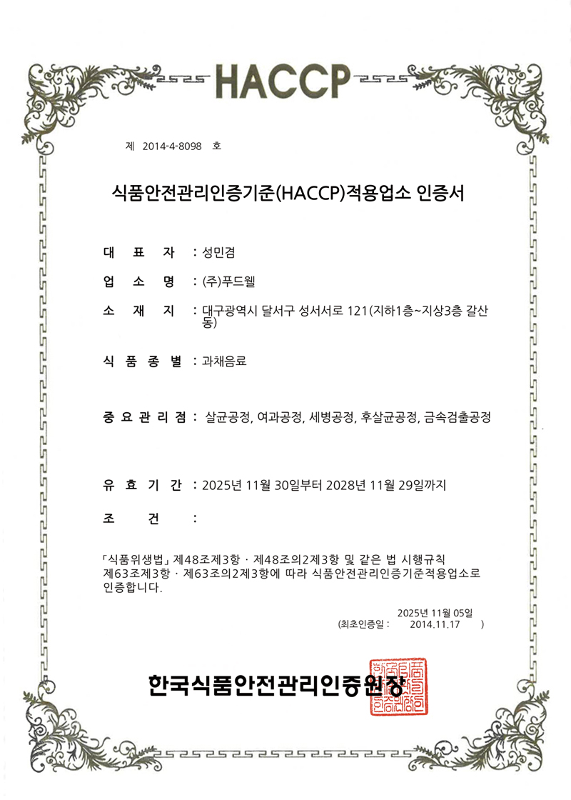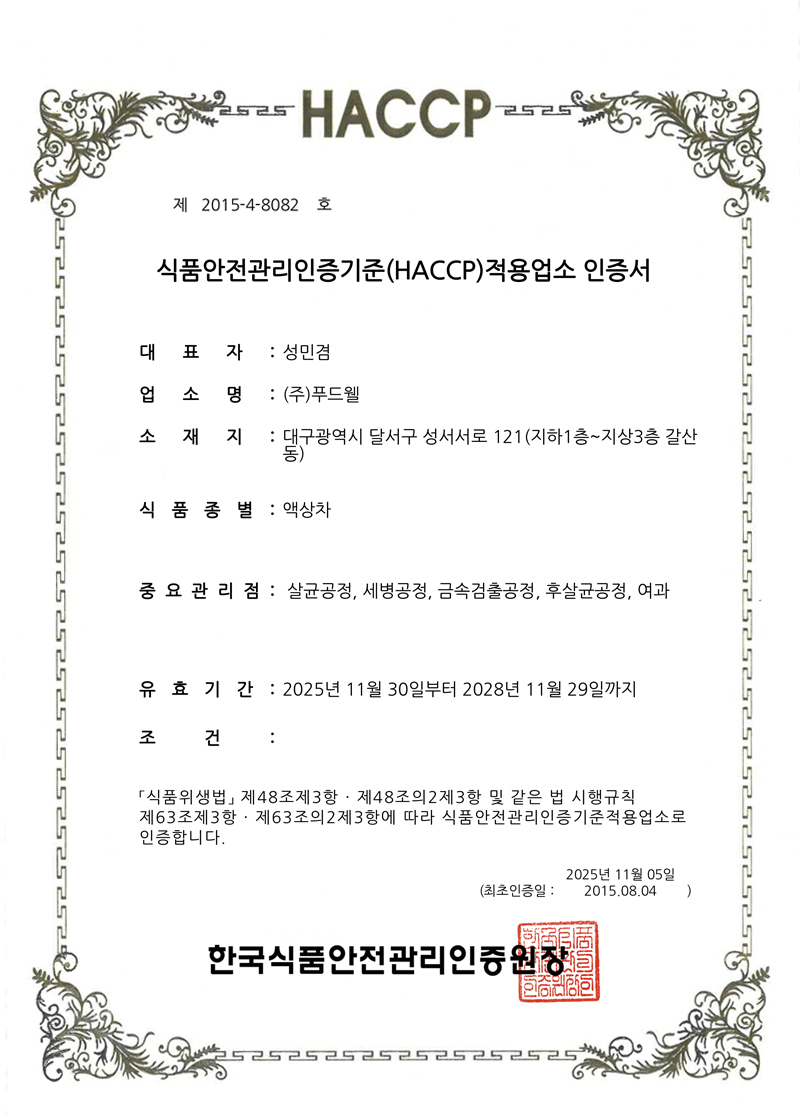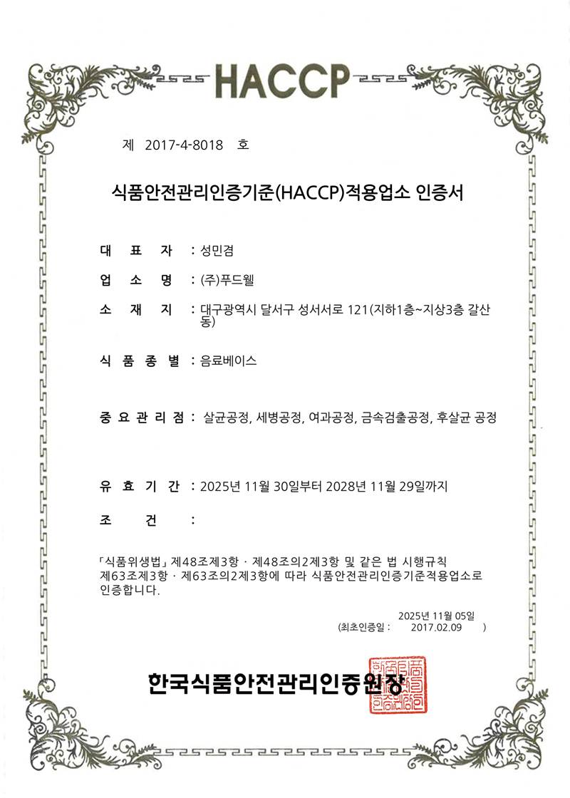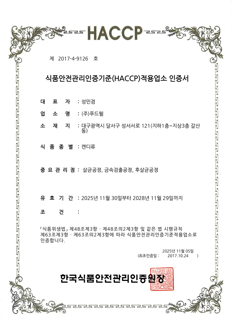 2005년 최초로 HACCP 적용업소로 지정. 식품의 원료생산 단계에서부터 최종소비에 이르기까지 발생할 수 있는 모든 위해를 파악하고, 중요관리점을 선정 관리함으로써 식품의 안전성을 확보하기 위한 예방차원의 관리활동으로 구성.